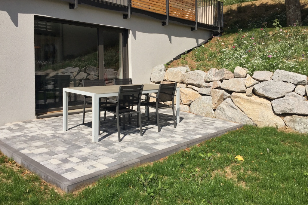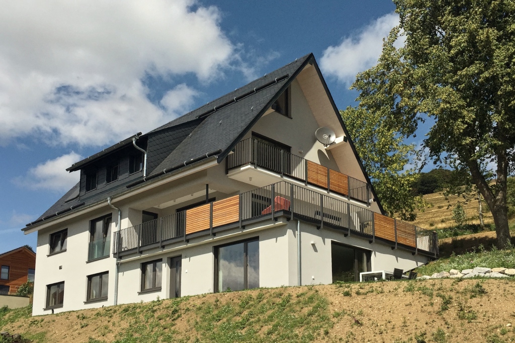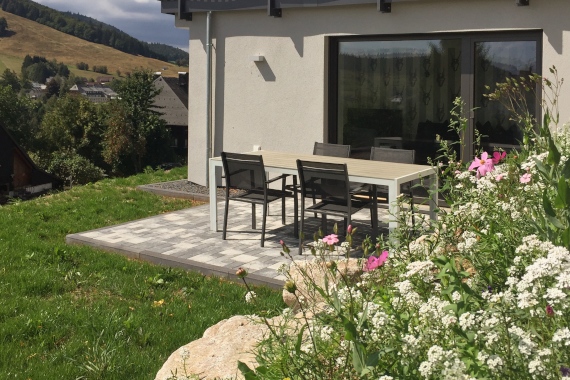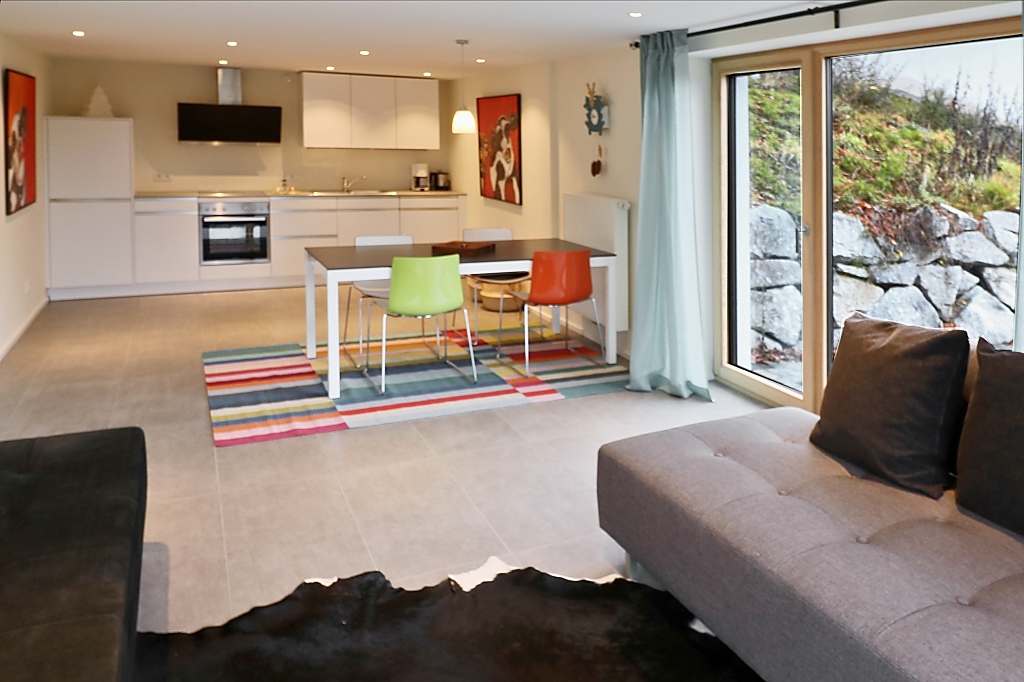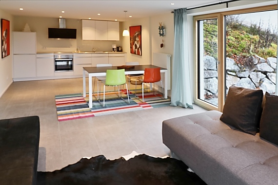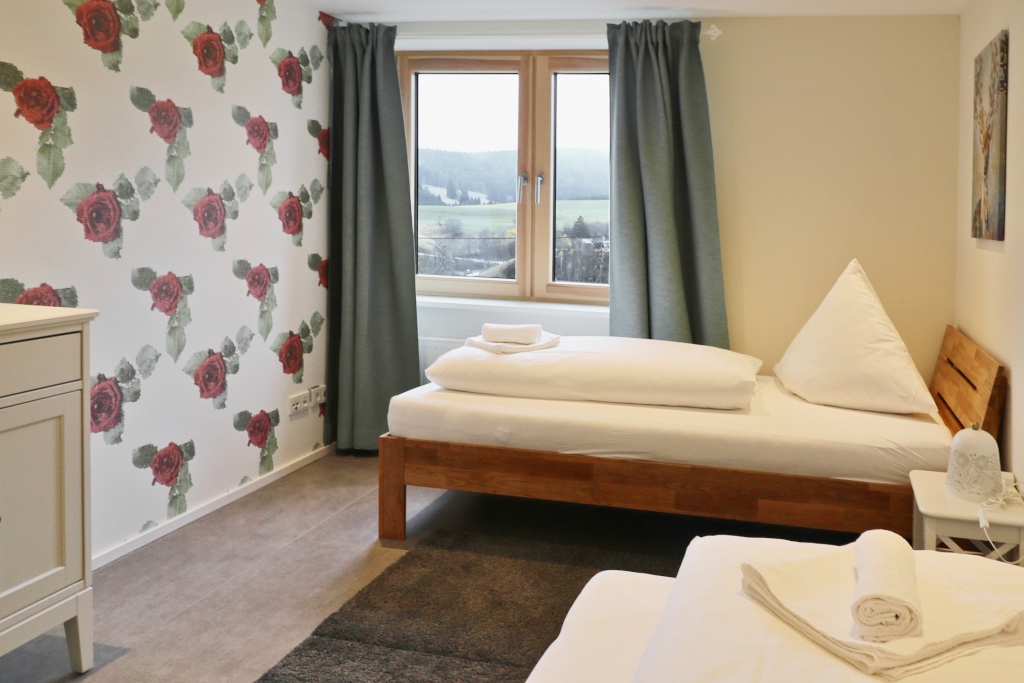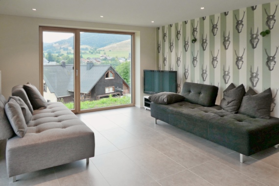 Die 90m2 große Ferienwohnung im Erdgeschoss des Hauses besticht durch eine liebevoll gestaltete Einrichtung, die modernes Design mit traditionellen Elementen des Hochschwarzwaldes kombiniert. Der großzügige Wohn-/Essbereich verfügt über eine vollständig eingerichtete Küche. Eine auf der Südostseite an den Wohnbereich angrenzende Terrasse bietet eine herrliche Sicht ins Bernauer Hochtal. Zwei gemütliche Schlafzimmer sind mit einem Doppelbett und zwei Einzelbetten ausgestattet. Das moderne geräumige Badezimmer verfügt über eine Großraumdusche und eine Badewanne